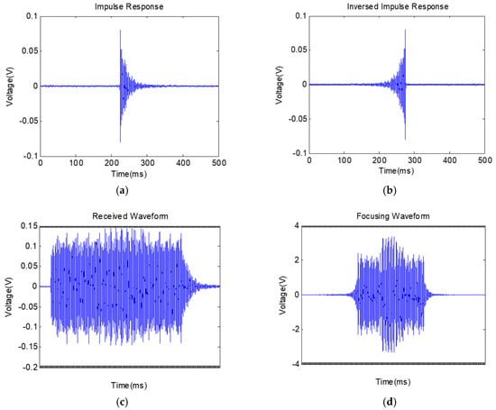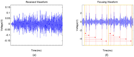 The impulse response is shown in Figure 14a, and the corresponding reversed impulse response is shown in Figure 14b. One pulse sequence representing [0 1 0 1 0 1 0 1 0 0 0 0 0 0 0 1 1 0 1 0 1 0 1 0] was transmitted through the channel, and Figure 14c shows the received signal. The corresponding focused waveform is shown in Figure 14d. Figure 14e,f show the first 30 ms of Figure 14c,d. From Figure 14f, the received waveform is refocused and the transmitted data can be clearly interpreted. The experimental results verified the effectiveness of this new communication system. Currently, the data transmission rate of the system can reach 67 bits per second (bps) using the stress wave-based transmission.