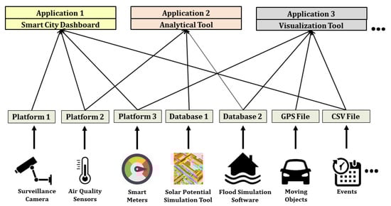 It shows that such smart city projects involve complex distributed systems having multiple stakeholders, diverse applications, a multitude of sensor and IoT platforms and data sources. To make well-informed decisions, it is very important to achieve a proper data integration strategy, which must allow working with heterogeneous data sources and platforms in a common operational framework. Such integrated information leads to joint and real-time analytics to manage aspects of how a city functions and is managed e.g., by using smart city dashboards [] as shown in Figure 1. However, as highlighted by Moshrefzadeh et al. [], due to data privacy concerns and competition between several stakeholders, it does not make sense to try to collect all available data resources within a central data repository. Rather, the data should remain with their owners and should be combined flexibly according to specific applications or stakeholders. This leads to the requirement of interoperability in order to deal with the heterogeneous sensor and IoT platforms. Such interoperability can be achieved by using open and international standards which, on the one hand, allow modeling and representing the data sources and, on the other hand, allow interfacing the distributed components that give access to data, visualizations, and analytical tools.