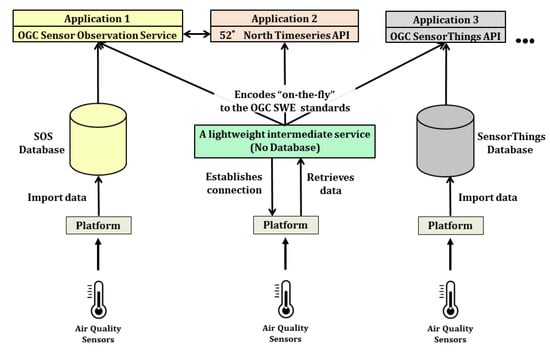 Comparison of the OGC SWE implementations for integrating IoT platforms with them. The implementations of OGC Sensor Observation Service and SensorThings API require importing the observations to their respective data storages. The motivation of this work is a lightweight intermediate service (shown in dark green) allowing connecting to the respective platform, retrieving observations and encoding them “on-the-fly” according to the OGC SWE standardized interfaces.