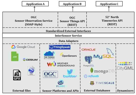 As we learned in the previous section, there are numerous sources which may be used for accessing sensor information ranging from a multitude of platforms, databases, and simple files. For managing such heterogeneous data sources, we have developed the InterSensor Service, which is a very basic and lightweight web service. It allows users to connect to different data sources (as mentioned in Section 2) and retrieve their time-varying observations directly from the source without requiring any additional data storage. The simplified structure of the service allows linking heterogeneous sensor observations to be analyzed and visualized together. Additionally, the service also allows encoding observations according to international standardized interfaces such as the OGC Sensor Observation Service and OGC SensorThings API. We have also developed an interface for the 52° North Timeseries API. Although it is not an international standard, it provides a REST-ful web binding to the OGC Sensor Observation Service in order to be easily queried and visualized by lightweight web applications. In this way, different observations from heterogeneous data sources can be accessed by common applications compliant to these OGC SWE specifications.