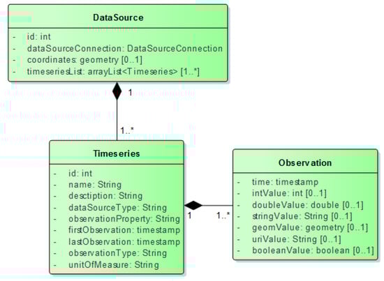 Upon establishing the connection successfully to a data source, the InterSensor Service generates three primary classes DataSource, Timeseries, and Observation. These three classes act as an intermediate layer to connect to a data source, retrieve observations and encode observations “on-the-fly” according to the standardized interfaces OGC SensorThings API and OGC Sensor Observation Service, and the open source Timeseries API. Upon a successful connection, the interfaces for the above-mentioned standards with appropriate classes are automatically generated.