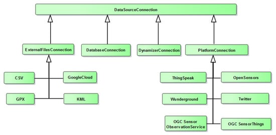 As shown in Figure 5, this class allows users to specify parameters to connect to individual data sources. It contains metadata attributes such as name and description of the data source, what type of connection it is (e.g., a CSV file, JDBC connection, a web service etc.). Furthermore, it contains subclasses to connect to different resources. ExternalFilesConnection provides connection details to external files such as CSV, GPX, KML and CZML, and also to Cloud-based documents such as a Google Fusion Table. DatabaseConnection contains parameters to connect to a specific database. In similar ways, InterSensor Service can also be used to connect to CityGML Dynamizers using DynamizerConnection.