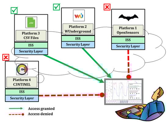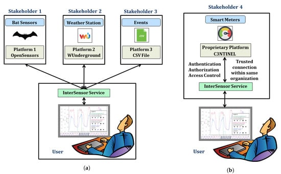 However, there might be scenarios when a data source e.g., C3NTINEL is proprietary in nature and contains confidential and secure information. In such cases, it is necessary to establish the trust between the stakeholder and the user. The platform requires secure credentials which may be in the form of username/password or OAuth 2.0 access tokens. Due to privacy concerns, the stakeholder would like to avoid revealing the secure credentials to the users of the InterSensor Service. In such cases (similar to the integration mode 2 of the BIG IoT), the respective stakeholder can configure an instance of the InterSensor Service by using the appropriate secure credentials and allow real-time observations to be accessed by the standardized interfaces (as shown in Figure 7b). In this case, without revealing the credentials to a user, the observations can jointly be analyzed with other properties. In this way, it is also possible to configure an additional layer of security facade for providing the appropriate access control. This access control layer allows the stakeholder to configure whether a set of users are allowed to retrieve the observations or not. Such additional security layers can be set up on the OGC-based web services by using an approach proposed by Chaturvedi et al. []. In this way, multiple stakeholders can set up the instances of the InterSensor Service for their respective platforms and ensure secure access to their information with the proper access control (see Figure 8).