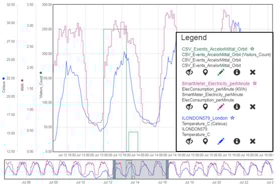 Figure 9 is a screenshot taken from the Helgoland application developed for visualizing and interacting with sensor data based on the 52° North Timeseries API. The interface from the InterSensor Service can directly be used with the Helgoland application allowing us to interact with observations being retrieved directly from a weather station (outside temperature retrieved from Weather Underground platform), smart meter located in an important building (electricity consumption per minute retrieved from the proprietary C3NTINEL platform) and scheduled events in the same important building (visitor counts during the scheduled event retrieved from a CSV file). Such joint visualization is helpful in determining the correlation between different properties, e.g., ”what is the impact of the weather or any scheduled event on the electricity consumption of a building?”. Of course, such a common standard-based API will also be very valuable for any other kind of application or analysis tool.