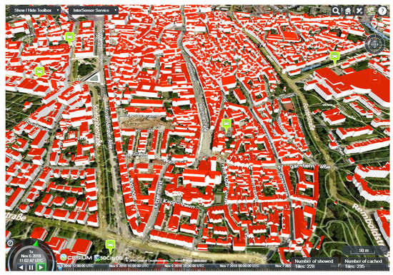 In the field of semantic 3D city models, ongoing research allows supporting time-dependent and dynamic data from sensors and simulations with the city objects. CityGML [], which is an international OGC standard to represent semantic 3D city models, is going to have a new module called Dynamizer []. It allows, on the one hand, representing time-dependent data and sensor data in standardized ways within a CityGML file, and on the other hand, providing a method for injecting dynamic variations of city object properties (like the electricity consumption of a building or the traffic density within a road segment) into the static representations. This concept has already been implemented within the initiative OGC Future City Pilot Phase 1 to support time-dependent solar power potential simulation results and to link real-time observations from Sensor Observation Services with 3D city objects [,].