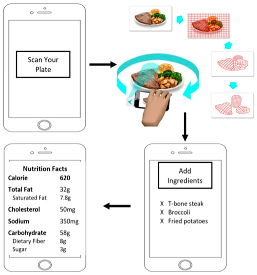 Recently, more advanced and sophisticated methods propose using sensors, high-quality cameras, and image processing to reduce these limitations and burdens, as well as to increase the accuracy of the measurements. The recent improvements to mobile devices and their growing infrastructure has allowed researchers to use smartphones as their main recording tool, especially due to the smartphone’s accessibility and convenience of recording information. These methods generally estimate the volume of the meal using 3D modeling. 3D reconstruction is usually done in two common methods, single-view (using one image of the meal) and multi-view (using multiple images from around the meal). The multi-view feature, in which the user can take three images of the meal from different perspectives, has shown better results in capturing information of a meal from all angles. However, a method developed by a team at the University of Pittsburgh and Cheng Kung University uses a single-view method and estimates the volume based on the previously captured model-based register [18]. The advantages of this method include a decrease in scanning time and not requiring a reference object. The developed method contains three main sections: base plane localization, food segmentation, and volume estimation. The base plane localization is the stage in which the actual measurements are modeled based on the dimensions of the plate itself. This method requires the user to measure the diameter and depth of the plate prior to or after the scan. Overall, this method has shown a very low error rate; however, with irregularly shaped meals, the single-view method might be limiting the use of this system in real life scenarios.