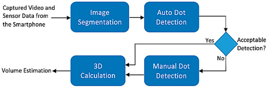 Our current approach to finding the most stable frames is using the accelerometer data from the smartphone and extract the appropriate number of frames to cover all corners and keep the processing time under five minutes. Once the frames are extracted, each frame will be processed separately and combined using photogrammetry to create a 3D cloud point of the entire portion size. Figure 13 shows an overview of the volume measurement algorithm of the DDRS.