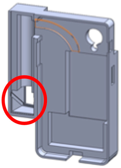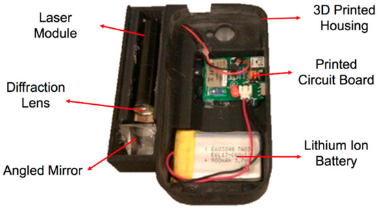 The design of the SLS in the DDRS system follows the triangulation method shown in Figure 5 by using a laser module, angled mirror, and a diffraction lens; a customized enclosure is created using a Computer Aided Design (CAD) software called SolidWorks (shown in Figure 6) [24]. The enclosure is designed based on the calculations shown in Equation (1). To ensure that the laser projection is located in the center of the smartphone screen when projected, a 2-dimensional angled mirror is placed in front of the laser module as shown in Figure 6.