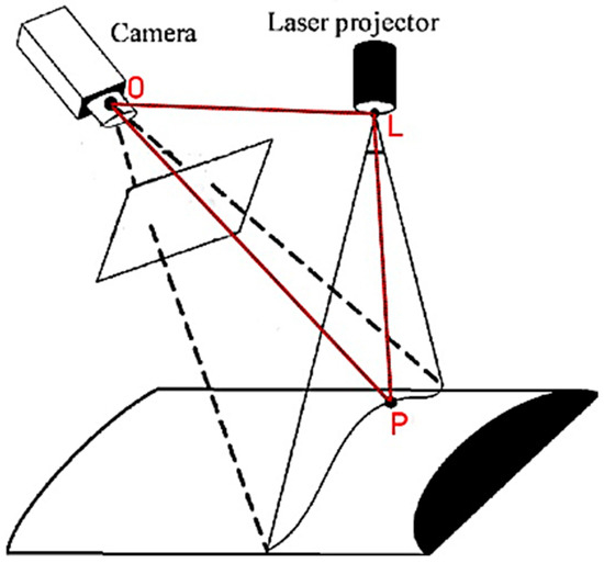 Figure 5 demonstrates the triangulation of a 3D point (shown in Figure 5). Once the system is calibrated (discussed in later sections), the relative distance between the projected point and the camera is determined using Equation (1):