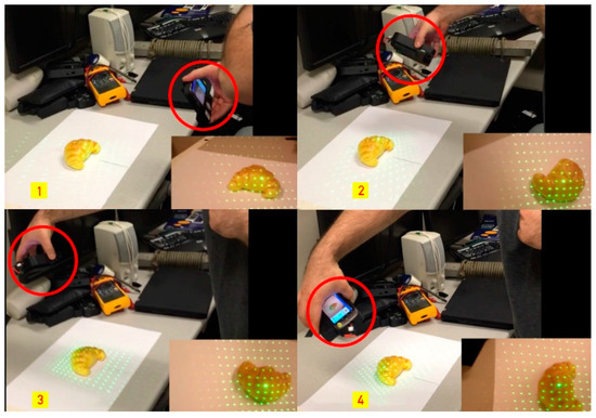 The diffraction lens projects an 11 × 11 matrix onto an object, which allows for the calculation of depth and texture analysis once calibrated. Using a matrix grid laser allows the system to do a 360-degree scan of the food (shown in Figure 7) rather than only from the top angle of the plate. This allows higher accuracy by scanning the sides of the food item, which is not possible with other approaches such as a line laser. That being said, the matrix grid laser is limited in scanning the entire plate, which does not outweigh the higher accuracy due to the medical application of the system. There have been different approaches using the line laser instead, which enables auto calibration while reconstructing a 3D image while scanning the entire food [26]. Unfortunately, the line laser method is not suitable for this system due to its lower accuracy and limitation in 360-degree scanning.