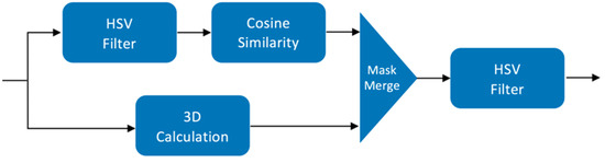 The presented approach, which uses a laser dot detection algorithm on a segmented image, adapts the computation of several successive image filtering and masking operations. The process allows the algorithm to see the laser dots and capture the actual distance from each point [27]. The three primary filters implemented for the algorithm are: the HSV-controlled filter that intensifies the green dots, the cosine similarity masking of the two image pairs, and the luminance erosion of the object image. Figure 10 shows the high-level block diagram of the automatic dot detection, which consists of the following four main functions: HSV filter, cosine similarity, luminance erosion, and mask merge.
