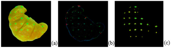 Eliminating the edges of the food (shown in Figure 11) requires image erosion which is applied with a structuring element to remove the thin outside edge on the border. Since the size of the structuring element is static, some dots on the border might be eroded and not located. The result is shown in Figure 11; the poor visibility of the green dots, shown in image Figure 11b, is improved by passing the frame through the luminance mask to overcome this hurdle, shown in image Figure 11c.