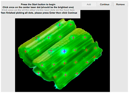 A manual dot selection algorithm is created to ensure that there are no unselected or wrongly selected dots, the manual dot selection algorithm is implemented using MATLAB. This feature includes a Graphical User Interface (GUI) that allows the user to manually identify the laser dots, which are not detected by the algorithm. This final error-catching step can be seen in Figure 12. The use of celery is intentional to show the system’s limitation in identifying the laser dots on a green food item. The manual dot selection addresses this limitation.