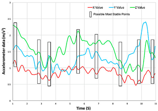 To achieve a thorough 360-degree scan of a meal, the user takes a circular video of the food. Since processing an entire video file would take hours, specific frames are chosen automatically by the algorithm using the accelerometer data to find the most stable frames. As seen, the highlighted points in Figure 14 are the frames which the highest stability coefficient can be achieved in all three axis. Based on the preliminary data calculations, the equilibrium number of frames for producing an accurate measurement and keeping the process time under 5 min, is six frames. Figure 14 shows the accelerometer data from one of the DDRS devices and the most stable timestamps.