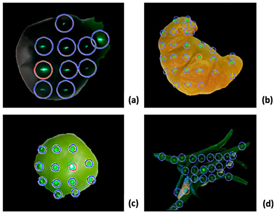 Preliminary results of the automatic dot selection algorithm and edge detection show the ability to crop and detecting dots on round, sharp, and irregular shapes of food, such as: (a) a pear, (b) a croissant, (c) an apple, and (d) green beans.