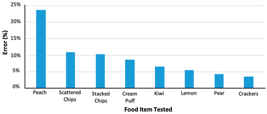Additionally, another source of error in volume estimation comes from the low-density high-volume foods, such as stacked chips and scattered chips were also relatively high. This is due to the irregular shape of the object that creates random air gaps in between, hence, a large volume. This is partially addressed by conducting a 360-degree scan. The DDRS scanner uses 360-degree scanning approach to get information from the side angles of the food. This enables capturing more information such as the number of items (potato chips, grapes, etc.). The next step taken to address this issue is to approximate the volume adjustments by calibrating the algorithm to known low-density high-volume items. Unfortunately, this approach is limited since it is not possible to calibrate for all possible scenarios; however, since the system is designed for medical applications, often, the food items in the studies are known or discussed before. Hence, the calibration can be done to overcome this obstacle.