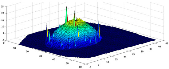 The luminance filter begins by first isolating the background of the image, which, in this case, includes everything that is not a laser dot. This is accomplished by performing a morphological opening operation using the structuring element of a disk shape. In this scenario, the morphological opening means the dilation of the erosion of a set, , by a structuring element, . This operation is shown in Equation (9):