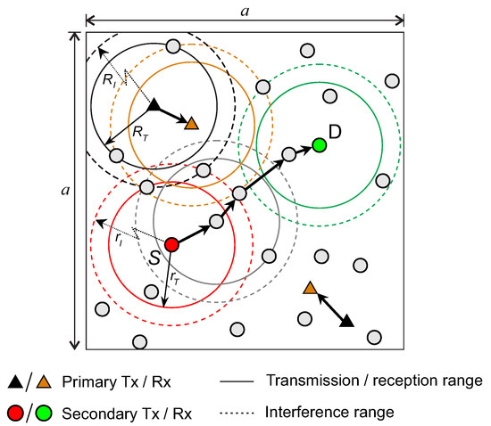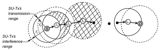 Illustration of multi-hop communication between two SUs in CRAHNs. a = 1000 m, = 250, = 5, = 0.5, = = 250 m, = = 280 m.