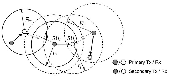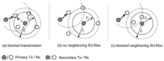 (i) There is at least one active primary receiver inside its interference range (refer to Figure 2a).