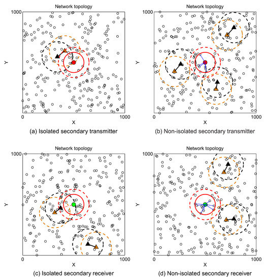Figure 5 illustrates the cases where secondary transmitter (red circle)/receiver (green circle) are isolated because of being blocked by an active primary receiver (brown triangle)/primary transmitter (black triangle) (refer to Figure 5a,c, respectively) and the cases where they are allowed to transmit/receive data normally (Figure 5b,d, respectively).