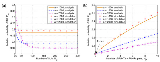 To quantitatively study the isolation probability of SUs and verify the correctness of (10) and (11) in Section 3, we plot the analysis results and simulation results of isolation probability of SUs for = 0.3, = = 250 m, = = 280 m. The probability of isolated SU versus the number of SUs is shown in Figure 6a. Network size, a, is varied from 1000 m to 2000 m. From Figure 6a, we can see an interesting feature, i.e., the isolation probability of SU, , greatly depends on network size, a, and the number of SUs, . Specifically, when the number of SUs is very small, i.e., = 25, the isolation probabilities of SUs in the cases of a = 1000 m and a = 1500 m are very similar ( = 0.182 and = 0.185, respectively). However, in the case of a = 2000 m, the isolation probability of SU is much higher ( = 0.362) because SU density is exponentially decreased with respect to the increase in network size. As the number of SUs in the network area gets higher, the isolation probability of SU remarkably decreases until it reaches the minimum values of 0.082 (−55.68%) when = 76, a = 1500 m, and 0.046 (−87.29%).
