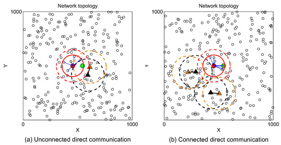 Next, we will study the possibility of having a direct communication link between two adjacent SUs in CRAHNs. Figure 7a illustrates the case that direct communication link cannot be established because the secondary receiver (green circle) is blocked by an active primary transmitter (black triangle). On the other hand, there exists direct communication link in Figure 7b because secondary transmitter (red circle) does not interfere with any active primary receivers (brown triangles) and secondary receiver is not interfered by any active primary transmitters.