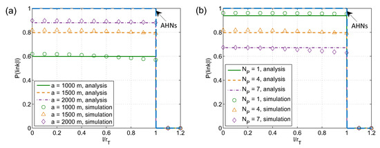 Figure 8 shows the probability of having a link between two SUs versus the relative distance for different values of network size, a, and the number of PU-Tx-PU-Rx pairs, . The analysis results obtained from (14) in Section 3.2 are compared with simulation results. Overall, this mathematical model can reflect the average value of link probability. The simulation result of link probability is higher than the average value when is small and reduces as increases. This feature can be explained as follows. When the distance between SU-Tx (SU) and SU-Rx (SU), l, is much smaller than transmission range, , the mutual impacts on SU of the primary transmitters of the primary receivers interfered by SU, i.e., PU-Txs(PU-Rxs(SU))) ⇒ SU, and vice versa are considerable, leading to higher possibility that SU and SU are blocked. As the distance l gets higher, this effect is relieved. In addition, as observed from Figure 8, similar to AHNs, it is obvious that when the distance between secondary transmitter and secondary receiver is larger than transmission range (or ) they cannot communicate directly. We can also see that link probability is not linearly proportional to both a and . Especially, varying results in more significant influence than varying a.