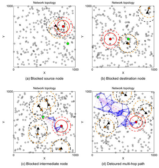 We are now interested in examining the path connectivity between two arbitrary nodes. Figure 9a–c present the cases that source SU (red circle) cannot establish communication path with destination SU (green circle) because source node, destination node, and intermediate node are blocked by active PUs, respectively. Figure 9d illustrates the case where there exits routing paths from source SU to destination SU. However, due to the coexistence of active PUs, the routing paths have to detour.