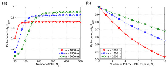 Figure 10b plots the path connectivity, , versus the number of PU-Tx-PU-Rx pairs, , for different network sizes a. The results in Figure 10b show that path connectivity degrades rapidly as a greater number of PU-Tx-PU-Rx pairs appear in the networks, especially when network size is small. More specifically, in the range of from 0 to 10, reduces from 0.997 to 0.681 (−31.69%), from 0.999 to 0.552 (−44.74%), and from 1 to 0.329 (−67.10%) corresponding to network sizes a = 2000 m, a = 1500 m, and a = 1000 m, respectively. The reason is that when the number of PU-Tx-PU-Rx pairs increases, the remaining network area for communication among SUs is greatly reduced.