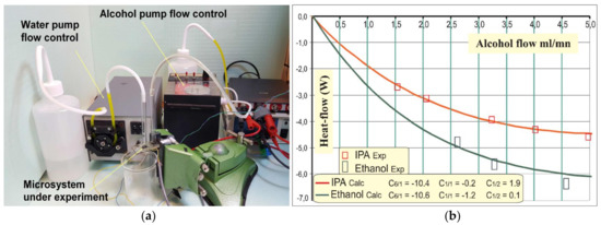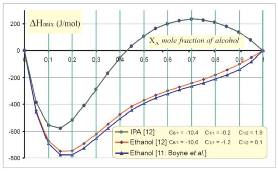 Both ethanol and isopropyl alcohol (IPA) mixed with water have been investigated, considering references 11 and 12. Products used in this paper were high-quality products (Ethanol Rectapur™ 99.5% in vol. and IPA Normapur™ 99.7%) mixed with deionised water (10.6 MΩ·cm). Taking advantage of both the Boyne’s study [] and the Peeters and Huyskens polynomial model [], the excess enthalpies of mixing for any case of combination may be calculated. For instance, one may resort to the following fitting equation, where XW and XA denote the respective mole fraction of water and alcohol within the blend experimented with: