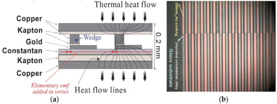 Heat flow meters (HFMs) are nowadays quite common self-generating sensors allowing measurement of heat transfers with internal low noise due to their reduced output impedance. Indeed, Z0 may range between 100 Ω and 2 kΩ [1-chap.XI, 6,7,8] with the most common devices designed in the laboratory. A generic structure, based on a planar thermopile, is depicted in Figure 2a. Basically, such a device relies on differential thermocouples arranged in series along a meandering path. Then, as one thermojunction out of two is subject to the heat flow driven through the upper collector, the numerous entailed local voltages are added in series accounting then for the thermal energy proceeding across the sensing area. The top view of a real specific set of plated thermoelements is given with Figure 2b. Practically, sensitive areas may be realized with sizes ranging from 1 cm² up to 25 cm² depending on either microtechnologies with sputtering processes, or classical printed circuit techniques involving electroplating. Both approaches hinge on photolithography [] and the manufacturing process is pliant enough to customize planar thermopiles on request, even fitted for radiant measurements [,]. With response time values in the order of one second, HFMs, functional in the field of control, come up as noteworthy solutions in case of unsteady transfer analysis.