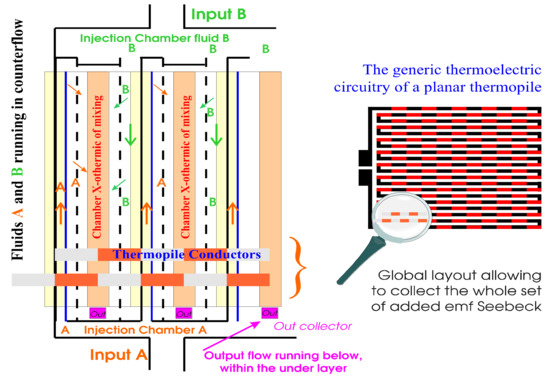 Although designed with a same view to monitoring heat exchanges in continuous flow, HFM-based sensors (Figure 2) and devices working with a distributed mixing chamber (Figure 4 and Figure 5) are systems quite different from one another. Since HFM configurations hinge on heat exchanges through the sensing surface, their output voltage depends on the temperature gradient perpendicular to the sensing surface: then, a heat sink is mandatory for proper operation. Conversely, composite mixing chambers allow a direct local heat distribution upon one thermojunction out of two; then, each heat exchanges entails its respective δθ (parallel with the plane of the thermopile) working as a thermal differential mode: moreover, insofar as the global heat is evacuated, the mean temperature of the substrate acts as a thermal common mode with a somewhat limited influence on the output signal due to the Cxy parameters drift (Figure 1) function of temperature (impacting ΔHmix in Equation (1)). Hence, with small chemical interactions the heat sink is optional.
