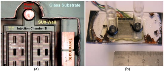The prototype experimented with includes a thin planar thermopile featuring 360 plated thermoelements, coated with 3 matched compartments over a whole 1.44 cm² acting surface (Figure 6a). The fabrication process is single sided, and requires six mask layers: 1 for a first SU8 layer, 2 for the bimetallic thermopile, 1 for ensuring both the electrical insulation and chemical protection, 1 for building the walls and pads and 1 for the upper face (covering lid). Indeed the device is mounted on a standard glass substrate 1 mm in thickness [Elka® Micro Slides 76 × 26 mm, λ = 1 W/(m·K)], allowing a fair reference isothermal condition. The thermopile relies on the constantan thermoelectric alloy [poorly conducting material; σ1 = 52 (µΩ·cm)−1] plated with gold conductors [highly conducting material; σ2 = 2.2 (µΩ·cm)−1] prior covering with the patterned SU-8 layers. It must be noted that numerous parameters are involved to account for the optimization of such a thermoelectric device; thermal and electrical conductivities, the effective thermoelectric power of the plated structure and dimensional parameters are among the most important to be considered []. For instance, the first SU8 layer arranged between the substrate and the constantan allows optimized δθ values between each thermojunction.
