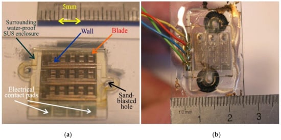 At first, after chemical and plasma cleaning, the glass substrate is coated with the aforementioned thermally insulating SU-8 layer (Microchem® 2100 mask #1), 100 µm in thickness (post-bake at 95 °C, λ = 0.3 W/(m·K)). A constantan layer (600 nm) is deposited by RF magnetron sputtering (PLASSYS-BESTEK, Evry, France MP-450-S). Then, a continuous meandering path (50 µm in width, legs 50 µm apart: mask #2), ended with the contact pads, is wet etched, prior to deposit the gold-plated electrodes. The latter (400 nm in thickness, 2 mm in length, 50 µm in width: mask #3) are processed by classical lift-off techniques []. Then, a SU-8 protective and electrical insulating layer (10 µm; MicroChem® Corp, Westborough, MA, USA 2010) is spread, cured, and recessed by photoimaging (mask #4). Thereafter, the walls, blades and surrounding enclosure (Figure 6a) are patterned by way of a thick SU-8 layer (250 µm: MicroChem®), with the second last photolithographic stage (mask #5). Eventually, the device is oxygen-plasma treated so as to optimize the surface wetting properties, and the thin holes are drilled by way of sand blasting through the glass substrate allowing the water-based fluids to be steadily distributed into the set of channels both through capillary action and pressure due to the peristaltic pumps. Eventually, the lid (fitted with the outlet channeling) allowing the closing of the acting volume is fabricated with same techniques.