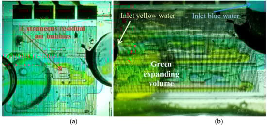 As a consequence of the dimensioning of the prototype, relevant working regimes had to be identified. To this end, a first coarse setting with water highlighted proper flow values ranging around 7 mL/min. Then, both inlets were supplied with coloured water (with, respectively, blue and yellow food dyes): a straightforward eye sighting of the green coloured volume allowed us to choose an apt duty point for the water flow (water as the solvent) and delineate the adequate range for the solute (alcohols). Hence, the best suited controlled water flow was fixed at 7.2 ± 0.2 mL/min. At this stage, first tests highlighted the critical issue as regards removing entrapped air bubbles as is clearly shown in Figure 7a. As regards filling tests, the detail of the green expanding area in a given transient regime is shown in Figure 7b.