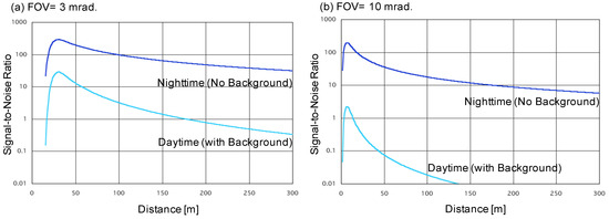 where M is the accumulation number, Q is the quantum efficiency of a detector, Δt is the sampling time, h is the Planck’s constant, ν is the pulse repetition frequency, μ is the noise factor of a detector (Photomultiplier: PMT = 1, Avalanche Photo Diode: APD = 2–3), Pb is the background light and Pd is the equivalent noise of a detector or amplifier. By using these equations, the echo intensity of the LED lidar was estimated and its specification fixed. The numerical parameters of the lidar components and atmospheric parameters are summarized in Table 1. The numerical analyses were conducted using two field of view (FOV) measurements: 3 mrad as the usual (laser based) lidar setup, and 10 mrad for a wide FOV. The estimated results are shown in Figure 1. Daytime background light power Pb was calculated by Pb = SΔλArΩ. Here, Sr is the luminance of background light. Δλ is the optical bandwidth. Ar and Ω are the aperture and the solid angle of the lidar optical receiver. The 3 mrad FOV case is shown in Figure 1a. The lidar echo has enough signal-to-noise ratio in the near range of up to 300 m in daytime and nighttime observations. The full overlap distance was 35 m. On the other hand, for the wide FOV (10 mrad) case, as shown in Figure 1b, the observation range can be up to 300 m at night, but reduces to <150 m in the day. The full overlap distance was shortened to less than 10 m because of a wider beam divergence and receiver’s FOV.