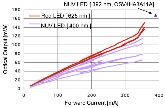 Figure 2 shows the relationship between the forward pulse drive current and the peak power of lamp-type LEDs; red-LED (625 nm: OptoSupply OSR5MA5111A-VW, OptoSupply, Hong Kong, China) and NUV-LED (392 nm: OptoSupply OSV4HA3A11A, 400 nm: OptoSupply OSSV5111A, OptoSupply, Hong Kong, China). The input pulse signals are 10 ns pulse wide with repetition of 100 kHz for NUV-LEDs, and 60 ns pulse wide with repetition of 100 kHz for the red LED. Each LED has different peak powers, even if they have the same model number. However, the maximum peak power was 100 mW. The output powers of the LEDs are designed taking into consideration the sensitivity of the human eye.
