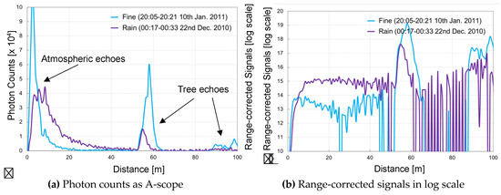 Figure 5 shows the atmospheric measurements taken by the LED mini-lidar at night. The measurements were conducted in a horizontal direction. Here, the PMT was propelled in the photon-counting mode with a multi-channel scalar (SRS SR430). The accumulation was about a million times. SR430 had the maximum repetition frequency of 1.6 kHz and its time resolution was 5 ns (0.75 m) as its BIN width. It was unable to follow the higher pulse repetition frequency of the LED mini-lidar, and the scaler chose a trigger in its timing rate, in place of LED repetition frequency. As a result, the summation time to obtain a certain signal-to-noise ratio of the atmospheric echoes was 16 min. The measurements were conducted on a fine day and a rainy day. In Figure 5a, the peaks near 60 m and 100 m are tree echoes. The atmospheric echoes were captured in 0–80 m and they gradually weaken due to their inverse proportionality to the square of the propagated distance. The numbers of scattered photons on the rainy day were larger than those on the sunny day because of the backscattered light from raindrops. The nearest peak of 0–5 m on the rainy day was smaller than that on the sunny day, which is a result of the strong scattering echoes of rain droplets at the closest distance. In Figure 5b, the range-corrected echo counts are shown in log-scale. Here, the change in atmospheric conditions are clearly visualized. Both measurements were conducted on surface atmosphere in a horizontal direction. When aerosol activity is high at a low altitude, the lidar echo reflects on the surface structure and conditions of the surface atmosphere. The echo activity of the fine day reflected the condition of the surface atmosphere. On the contrary, the echo curve of the rainy day became monotonous, which was a result of constant rainfall-subsided aerosols. These results matched with the estimated results of observation range, signal-to-noise ratio, and summation time. These experimental results verified the applicability of LED lidar in near-range atmosphere measurements.