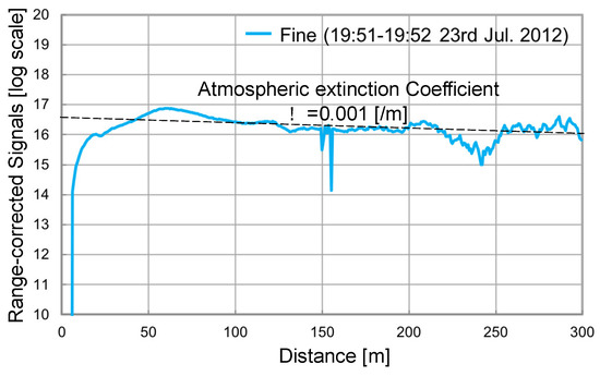 The Type 1 and Type 2 LED lidars enabled longer range observation. The high-speed photon counting board was used for atmospheric activity observation. The summation time was shortened with Type 2 because of the narrower beam divergence and receiver’s FOV, both of 3 mrad. It took more than three minutes with Type 1 to get the atmospheric echoes up to 300 m, but Type 2 shortened it to <1.5 min. Figure 8 gives details of the longer-range observation (up to 300 m) obtained by Type 2. The vertical axis indicates the range-corrected signals in log scale. The summation time was 100 s. The weather condition was fine. The observation was conducted in a horizontal direction. The activity of the surface atmosphere was observed with a short summation time. The average atmospheric extinction coefficient was estimated as α = 0.001 [/m].