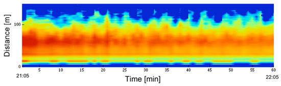 The Type 3 LED mini lidar was also used for activity monitoring of the surface atmosphere, as shown in Figure 9. The observation was conducted in a horizontal direction. To obtain images, summation time was set at 10 s. Continuous observation of one hour was visualized. The horizontal axis denotes time and the vertical axis shows the distance. Photon counts were represented by fake colors, by multiplying the square of the distance and taking its log-scale (range-corrected signal in log-scale). The weather conditions were clear, and atmospheric activity was low; however, small changes in the image can still be seen. Atmospheric echoes were monitored up to 100 m. When the summation time was increased to 30 s, the observation range was increased to 300 m for nighttime observation. Even in the day, the threshold was adjusted—the observation range was reduced to 100 m under the condition that the lidar be installed in a shade place.
