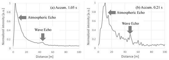 The observation results of sea surface atmosphere are shown in Figure 10. They were created with integration time of 0.25 s. The atmospheric echo was monitored from 10 m to 80 m, while the sea wave echo was obtained at 40 m ahead. On continuing the observation, activities of the sea wave motions and surface atmosphere were captured. Figure 10 indicates changes of the alternative lidar echoes against the summation time. Here, high-resolution photon counter was utilized [36]. Its time resolution was 1 ns, which is equivalent to a distance of 0.15 m. The summation times were: (a) 1 s and (b) 0.2 s, respectively. The observations were conducted at a sea coast with a shallow elevation angle and were the results of a synchronized observation of surface atmosphere and sea wave activities. Smooth echoes are obtained in Figure 10a. The atmospheric echoes reduced in number with respect to their inverse proportionality to the square of the distance; the sea wave echo was smooth as well. It represents the wavelength of the wave. On the contrary, the activity of the atmosphere and sea wave were captured at the instantaneous value of 0.2 s (Figure 10b). The undulating echo in the atmosphere was not noise, but disturbances. The observation height was 1–2 m; the atmosphere activates with the same cell size. Its activity was visualized as well. Sea wave echo represented its instantaneous condition, that is, its activities were visualized through continuous observation in a short period of 0.2 s.