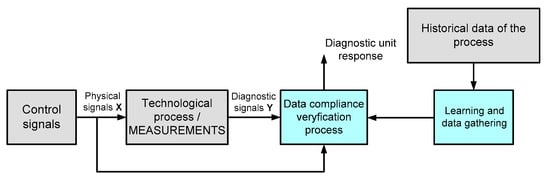 Diagnostic techniques based on the heuristic approach have been mainly used in complex applications that have rich databases containing relevant information about the operating conditions of the system in the past. Based on this knowledge, various methods for the extraction of intermediate dependencies between individual variables of the monitored process state and failure symptoms may be applied [,,]. Fault diagnosis is conducted by checking the conformity of the collected (historical) and currently measured data with the entire system. Heuristic knowledge includes observation, inspection, and collecting information in various forms: tones, vibrations, colors, temperatures, and signal amplitudes. The key source of this knowledge is the history of a given process, and above all: previous failures, maintenance, and repair operations experiences as well as statistical data collected from similar objects []. Notably, diagnostic algorithms based on heuristic knowledge use huge amounts of process data in real time and process the data online. For this reason, these methods are defined in the literature as techniques based on data analysis. A schematic diagram of these diagnostic methods is presented in Figure 1.