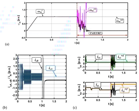 The mathematical model and detailed analysis (including stability analysis [,]) of the MRASCC estimator was described in detail []. Figure 4 presents the simulation analysis for the vector controlled drive system, with a broken current sensor in phase A (lack of signal). The current sensor was destroyed (in time t = 0.5 s). The effects of this fault are visible on all the analyzed transients.