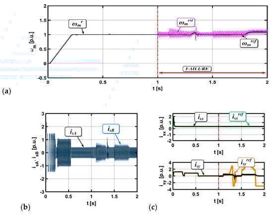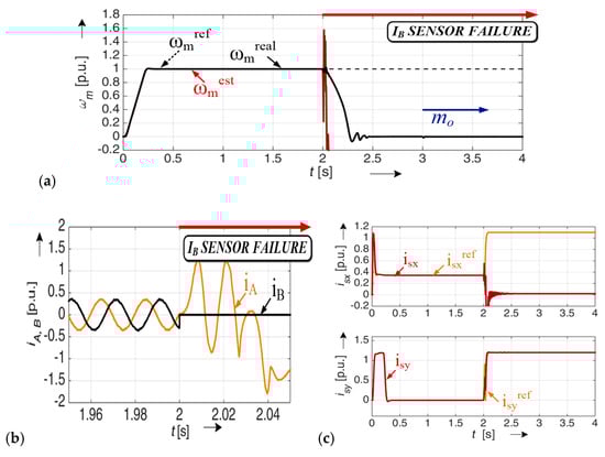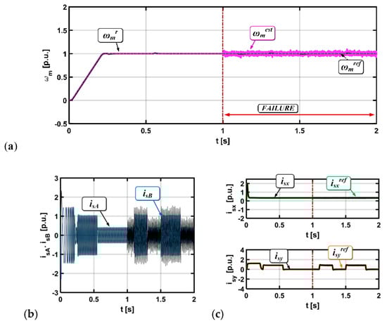 Results for the drive system with a broken current sensor in phase A (gain error), (rotor speed (a), stator current (b), stator current components x,y (c)).