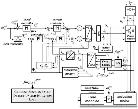 Thus, the main goal of this paper was to demonstrate a stator current transducers fault detection algorithms for the vector control (DRFOC) of an induction motor drive system based on an active detection system []. The proposed system guarantees stable operation of the drive during faulted conditions. This system is based on an artificial neural network trained with signals obtained from the internal control structure. The diagnostic method was analyzed and tested in different drive operation conditions. The simulations and experimental results of the proposed Fault Tolerant Control are presented.