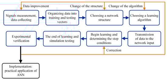 Designing the process of an artificial neural network for diagnostic purposes consists of several basic stages carried out cyclically in a multi-loop structure (Figure 9), in which the following elements can be distinguished:
