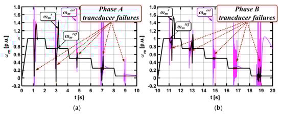 For the stator current errors, oscillations in the measured and estimated speed can be observed. For both types of faults, the electrical drive is stable and can work properly with a broken sensor.
