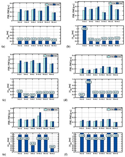 Bar charts with the values of ITSE and ITAE integral quality indicators and fault detection times for different NN learning cycles: (a,d) operation of the drive with a rated speed value, (b,e) rated speed and load torque values, (c, f) low speed value failure detection of the current transducer phase A (a, b, c) and phase B (d, e, f), simulation results.