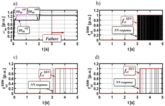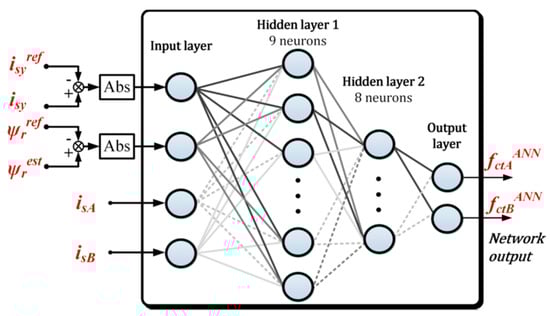 One of the most complex diagnostic methods is the technique based on artificial neural networks (ANN) for the faults symptoms extraction of a specific sensor [,]. Designed ANN detectors are trained on the basis of monitored transients of chosen measured signals in a wide range of the motor speeds. At appropriate time points, the failure of the tested sensor can be simulated. Based on the received teaching vector, the neural network is able to identify failure occurrence in real time. In this method, neither the mathematical model of the system nor the calculation of threshold limits for diagnostic signals are needed.