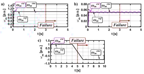 Measured, real, and estimated rotor speed during total failure of the phase A current transducer: (a) ωm = ωmN, mo = moN, (b) ωm = 0.05ωmN, and (c) ωm = ±ωmN, mo = moN reverse operation—experimental results.